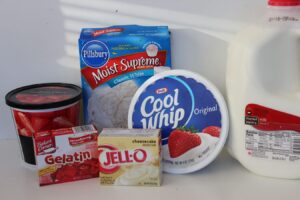 Bake the cake: Prepare the cake mix according to package directions in a 9×13-inch baking dish. Bake and let it cool for about 15 minutes.
