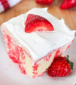 Bursting with fruity flavor, this retro-inspired treat combines a soft vanilla cake, sweet strawberry gelatin, and a fluffy whipped topping for the ultimate crowd-pleaser.