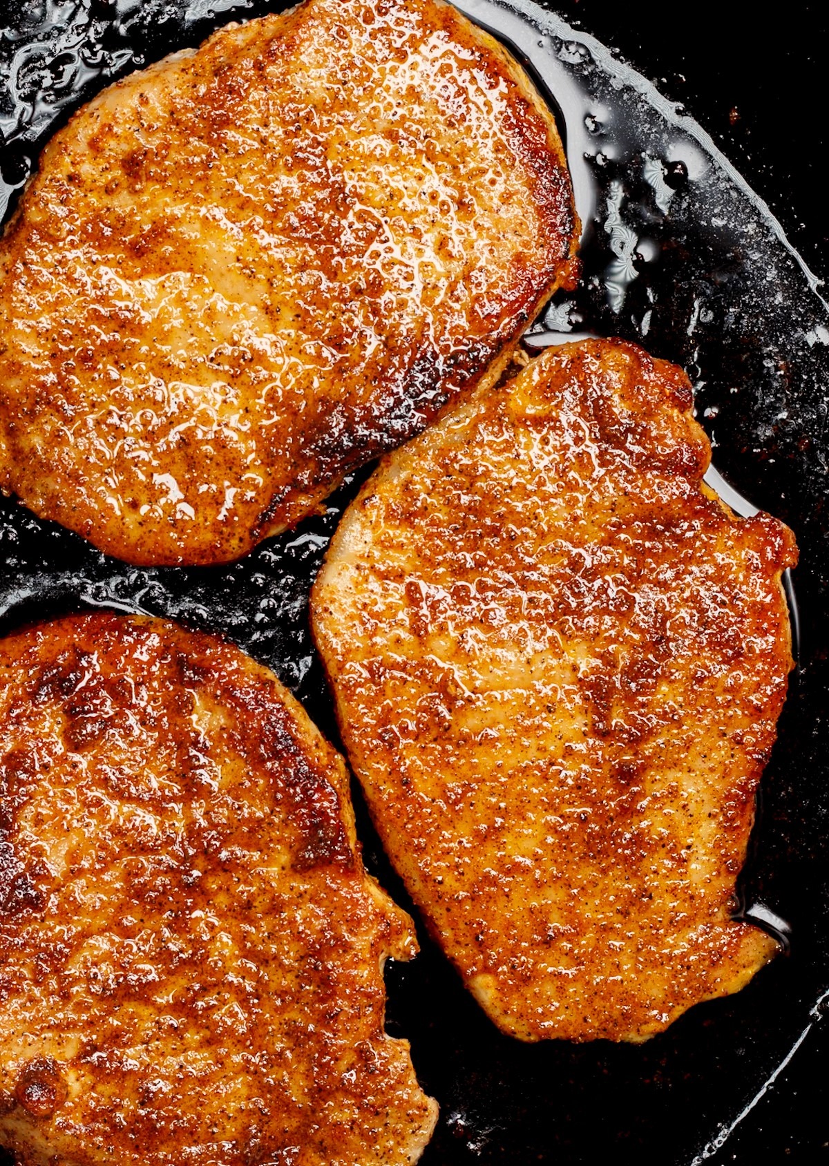 - Add pork chops and cook for 3–4 minutes per side until golden brown.