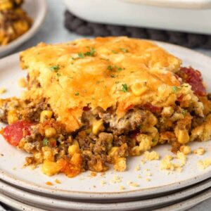Shepherd’s Pie (or Cottage Pie, when made with beef) is a comforting layered dish with seasoned ground beef on the bottom, mixed with vegetables like peas and carrots, and topped with creamy mashed potatoes.