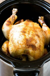 Use a rack or veggies as a base: Place carrots, celery, and potatoes at the bottom of the crockpot to elevate the chicken and create a built-in side dish.
